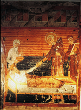 Nous sommes au début du VIè siècle. A Lutèce, Clovis qui règne depuis 25 ans sur le peuple Franc souffre d’une fièvre pernicieuse qui dure depuis deux ans. Sur le conseil de son médecin, Tranquillinus, il fait venir à son chevet Séverin, ce moine dont la renommée de ses vertus et de ses guérisons surnaturelles était parvenue jusqu’à la cour du premier roi chrétien. Séverin, avant de quitter le monastère, fait part à ses frères d’une vision qu’il a eue : ses adieux sont définitifs ; il mourra sans rentrer à Agaune ; deux de ses compagnons devront l’enterrer à Château-Landon (ad Castrum Nantoniense).